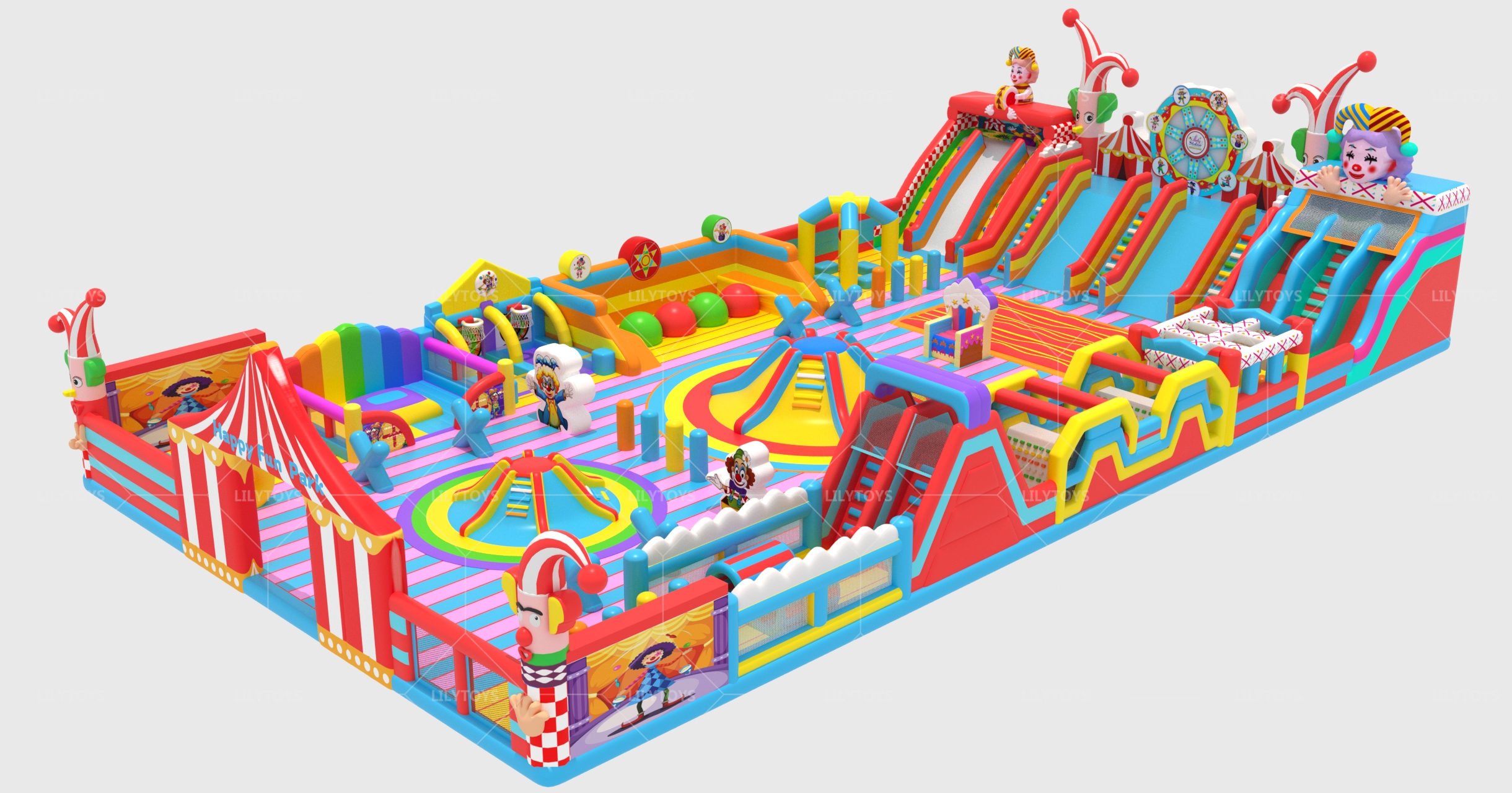 Toddler-Friendly Area: Gentle inflatable slides, soft bounce pads, and mini clown-themed obstacle courses. Designed with extra-thick PVC materials and rounded edges to ensure absolute safety for little ones aged 2-5.